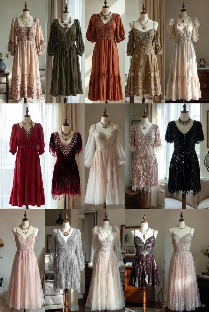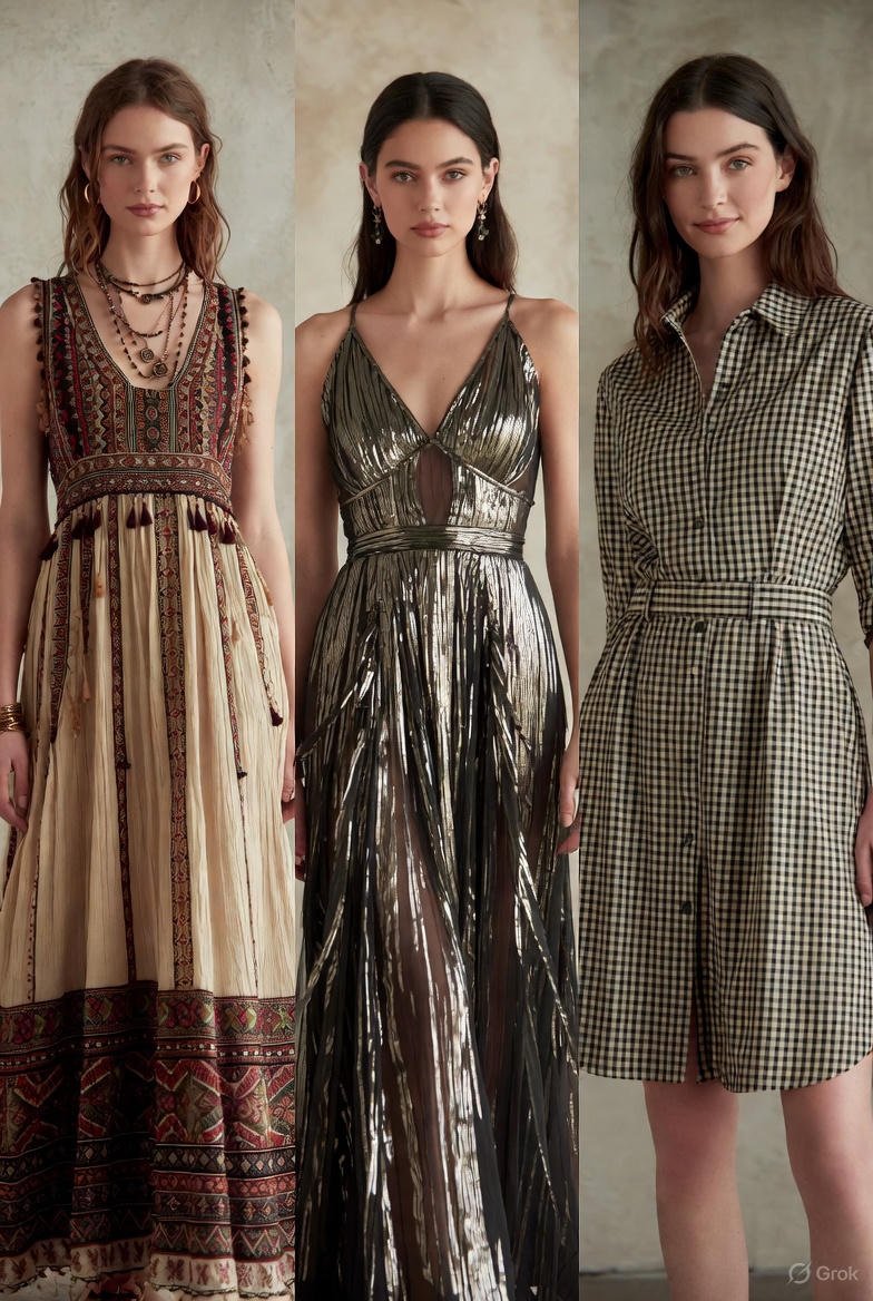 - Vacation → Flowy maxi western dress + straw hat + flat sandals