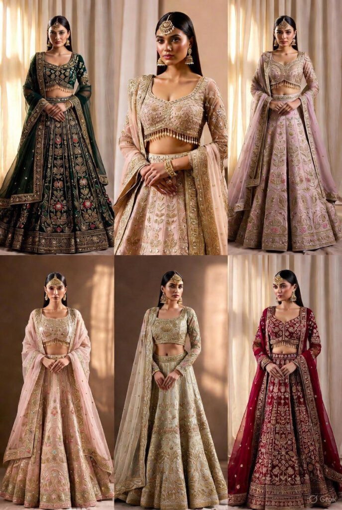 - Bridal lehenga vs sangeet/mehndi vs reception styles