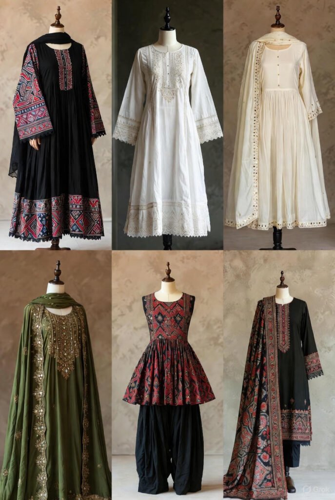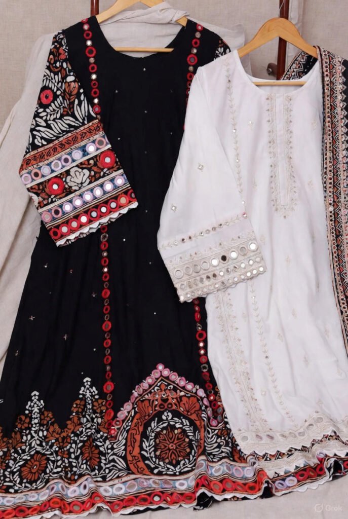 - Black or white base with contrasting Ajrak sleeves & border